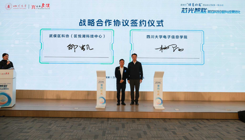 学院院长杨阳代表学院与成都市武侯区科学技术协会(区悦湖科技中心)签署了战略合作协议,依托武侯区重点打造的悦湖科技城(成都市首批人工智能与机器人"样板"产业园)充分发挥学院在芯片研发、人工智能、通信技术等领域的科研优势,与武侯区的产业需求和服务资源深度融合,共同推动前沿科技成果的转化与应用。校党委副书记黄园,学院党委书记彭舰代表校院与武侯区政府共同启动“诸葛论道”系列活动,旨在通过政府搭台,汇聚专家的“智力资源”、对接企业的“技术需求”、强化政府的“服务保障”,促进“纸上成果”加速走向“产业实效”,助力区域经济高质量发展。