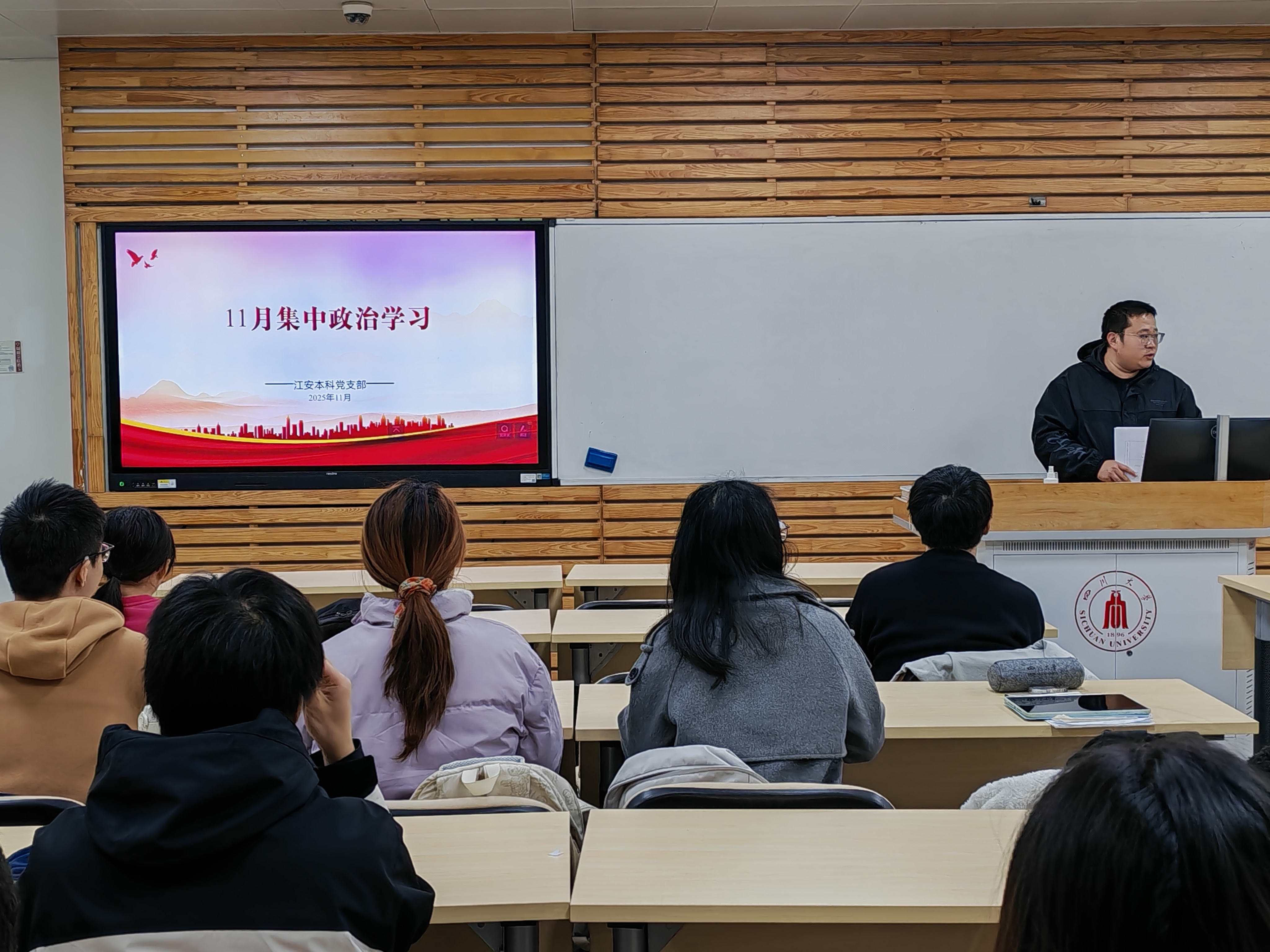 2025年11月23日晚,bat365在线体育登录江安本科党支部在望江校区基础教学楼A308组织开展11月集中政治学习、“红途轮忆,青讲党史”主题活动暨读书分享会。支部书记申鑫,支部党员、发展对象及部分入党积极分子参会。