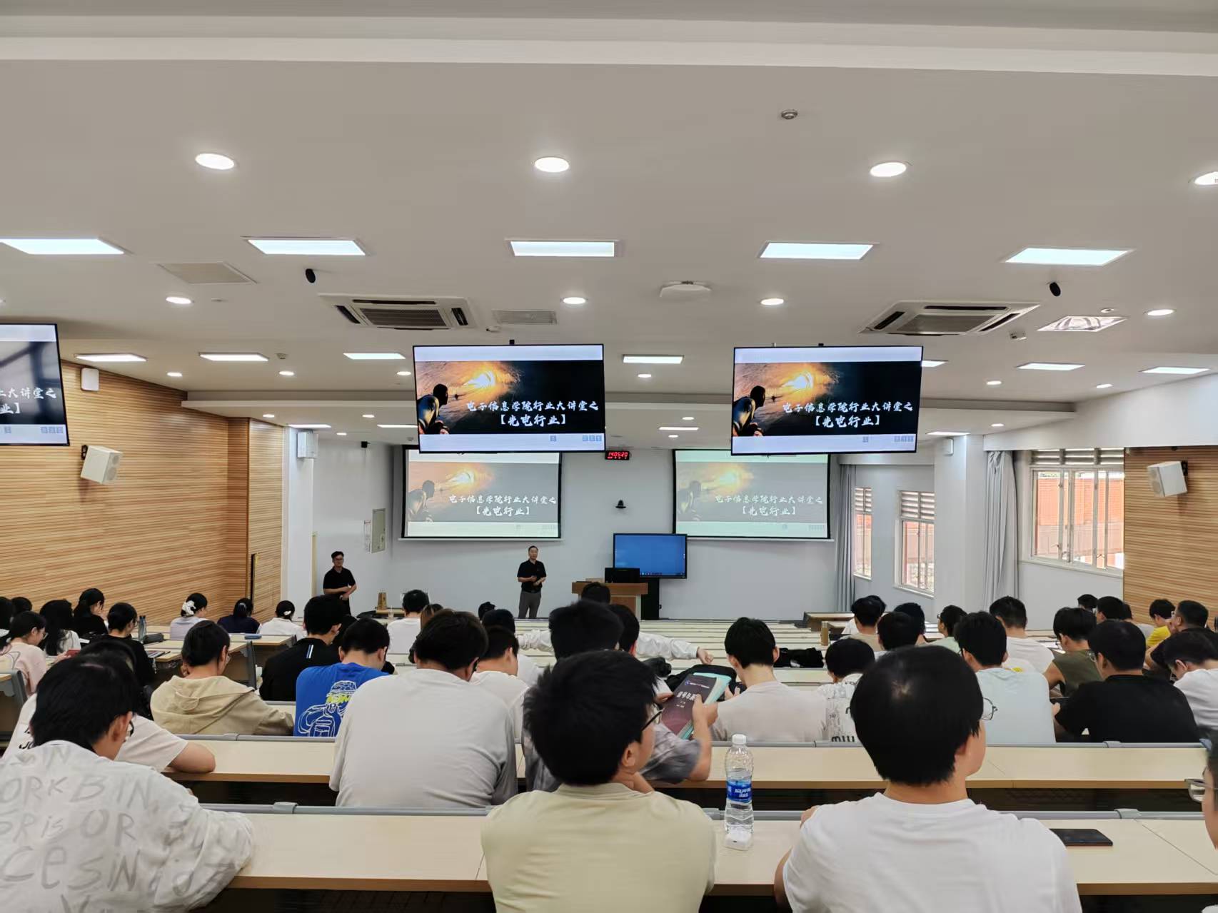 首先,肖总以“光成像行业的发展”为主题,系统梳理了光成像领域的发展历程、现状趋势与前沿应用,并分享了联合光电的企业文化与创新实践。在交流环节,同学们踊跃提问,嘉宾就职业发展、技术瓶颈等话题给予了精彩解答。现场互动频繁,氛围热烈,掌声不断。并且通过讲座也才让同学们知道,正式当初肖总等几位光电毕业生,2005年怀着梦想,通过20年的奋斗最终实现了在高端光学镜头领域打破了日本垄断,实现了国产化。