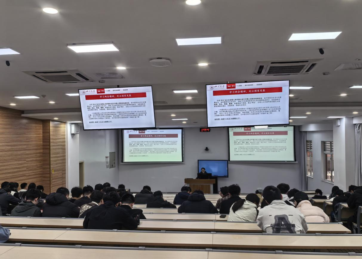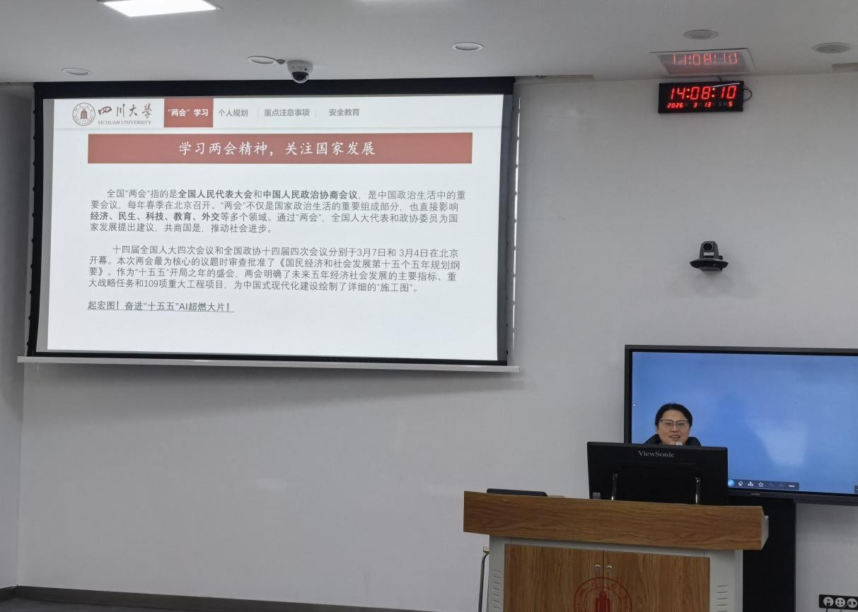 2026年3月13日下午14:00,bat365在线体育登录本科2022级辅导员陈林老师在望江校区基础教学楼C203组织本科2022级全体学生开展“学习两会精神,关注国家发展”专题学习活动,引导青年学子深入了解国家大政方针,增强使命担当意识。