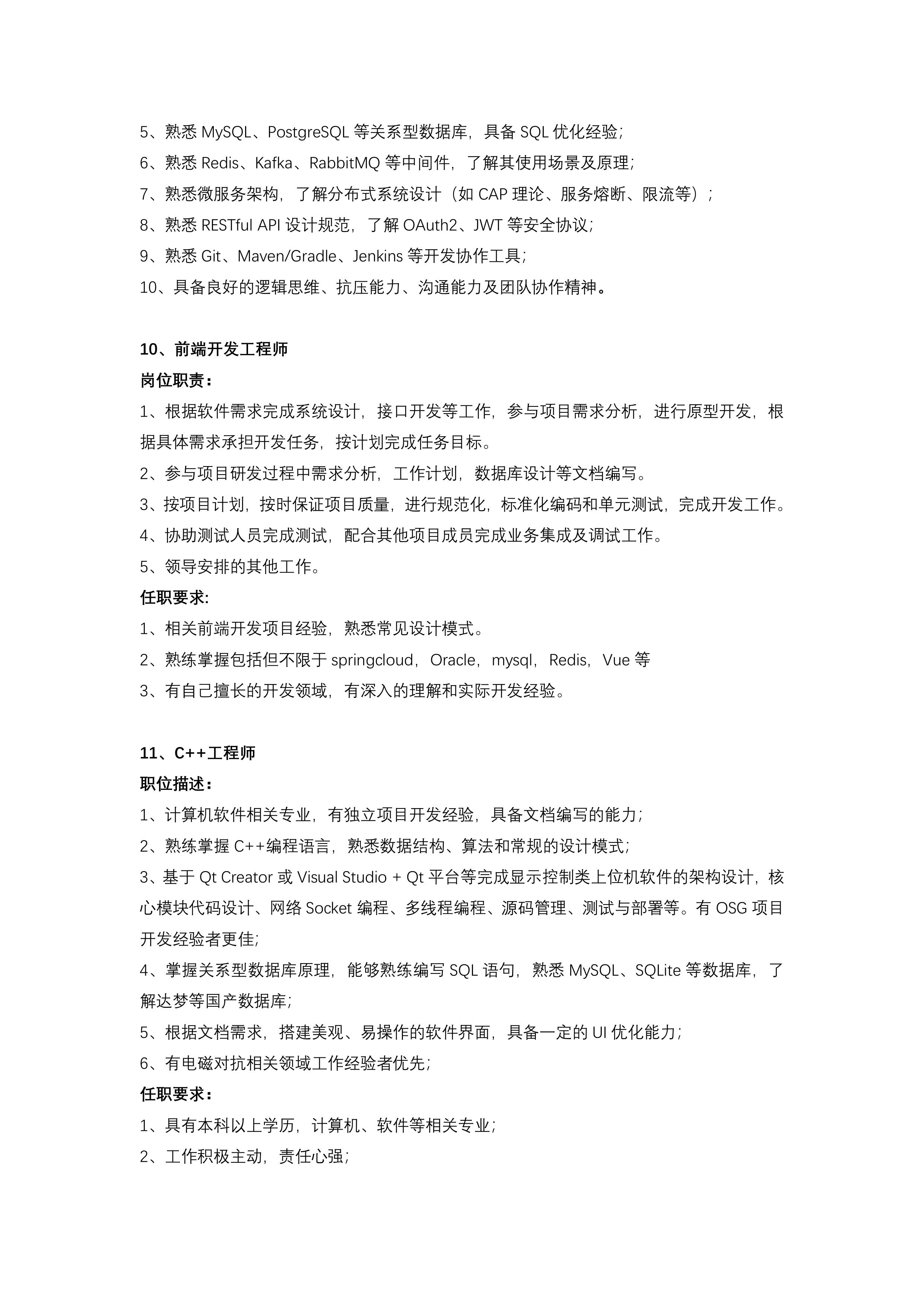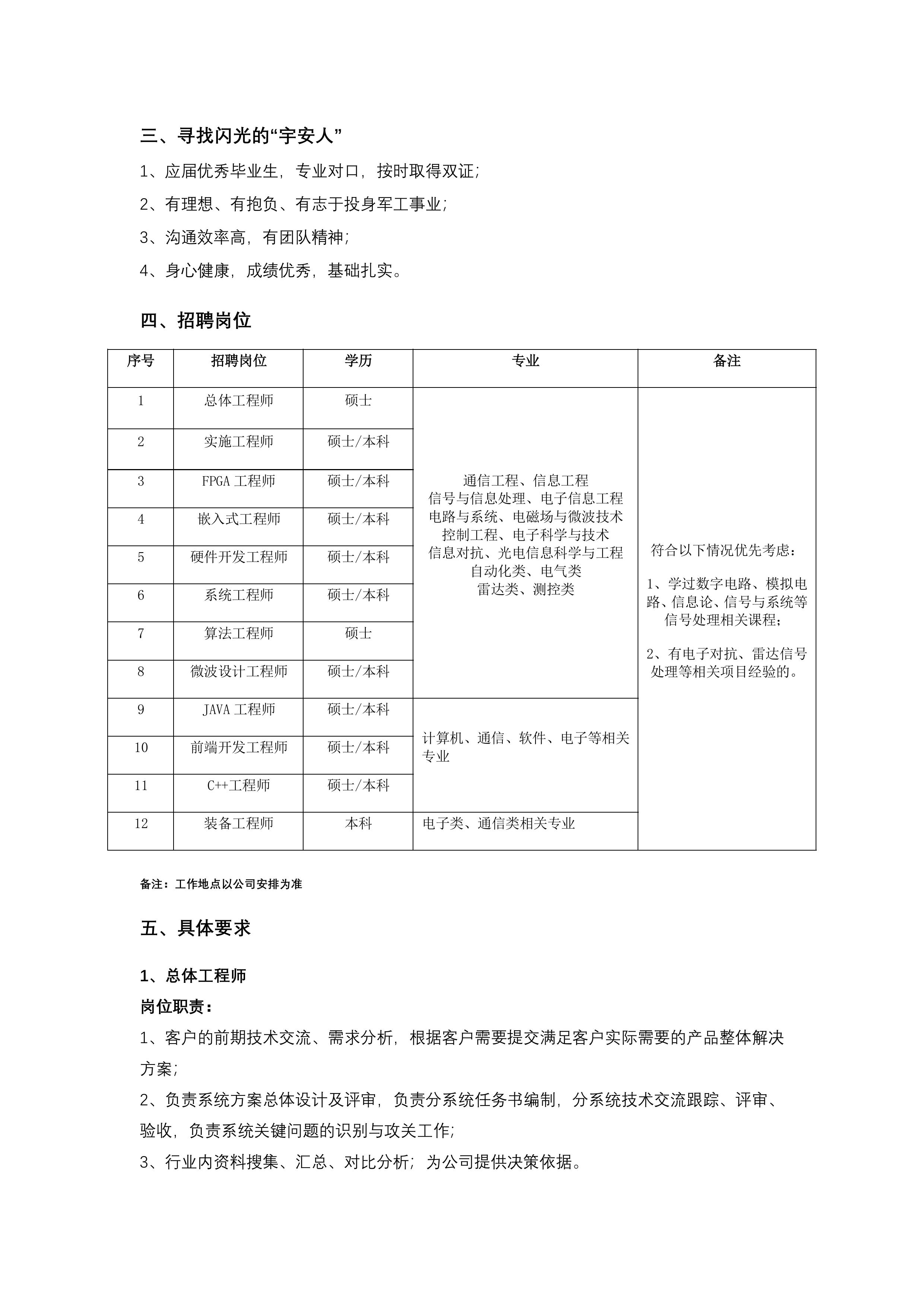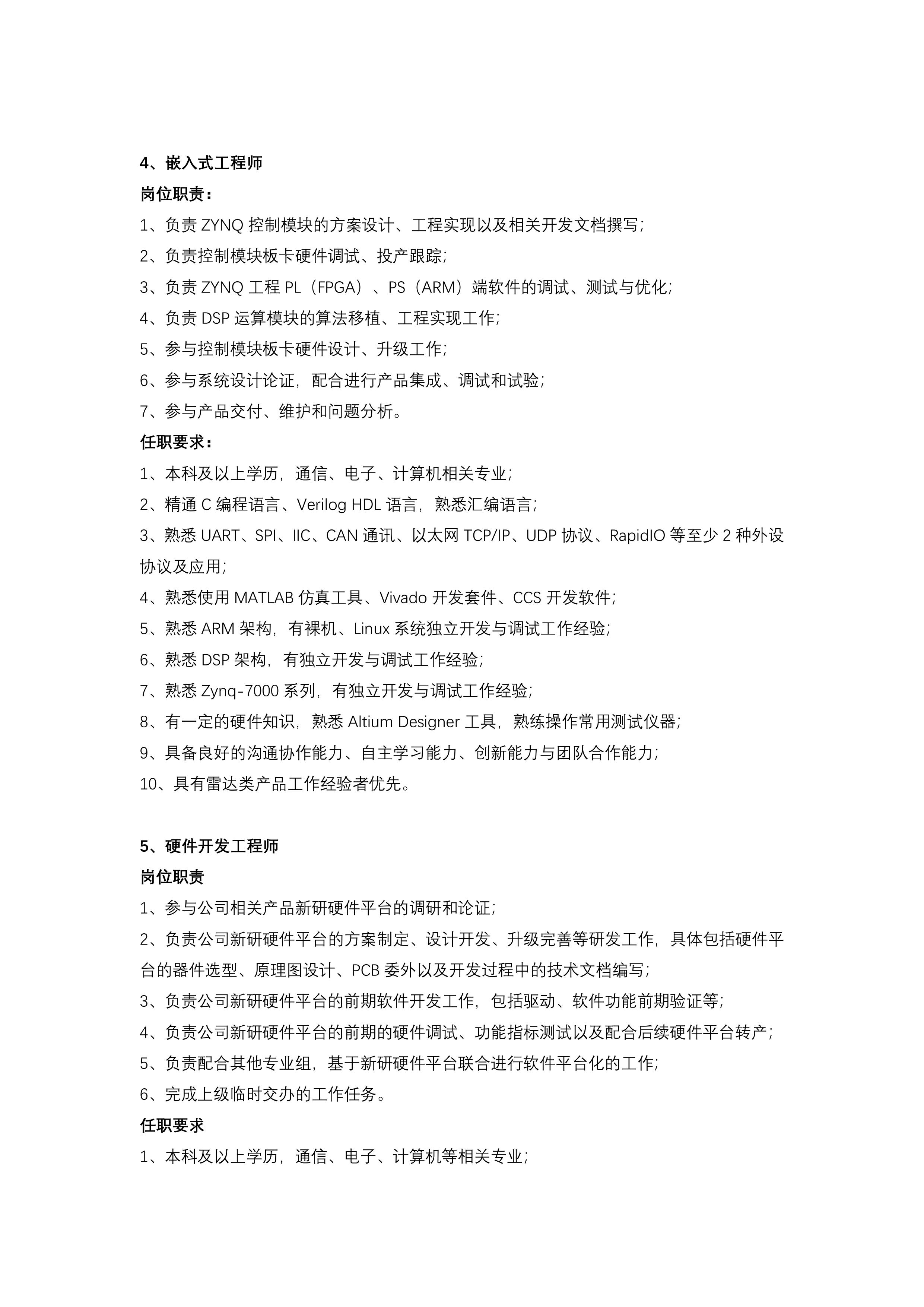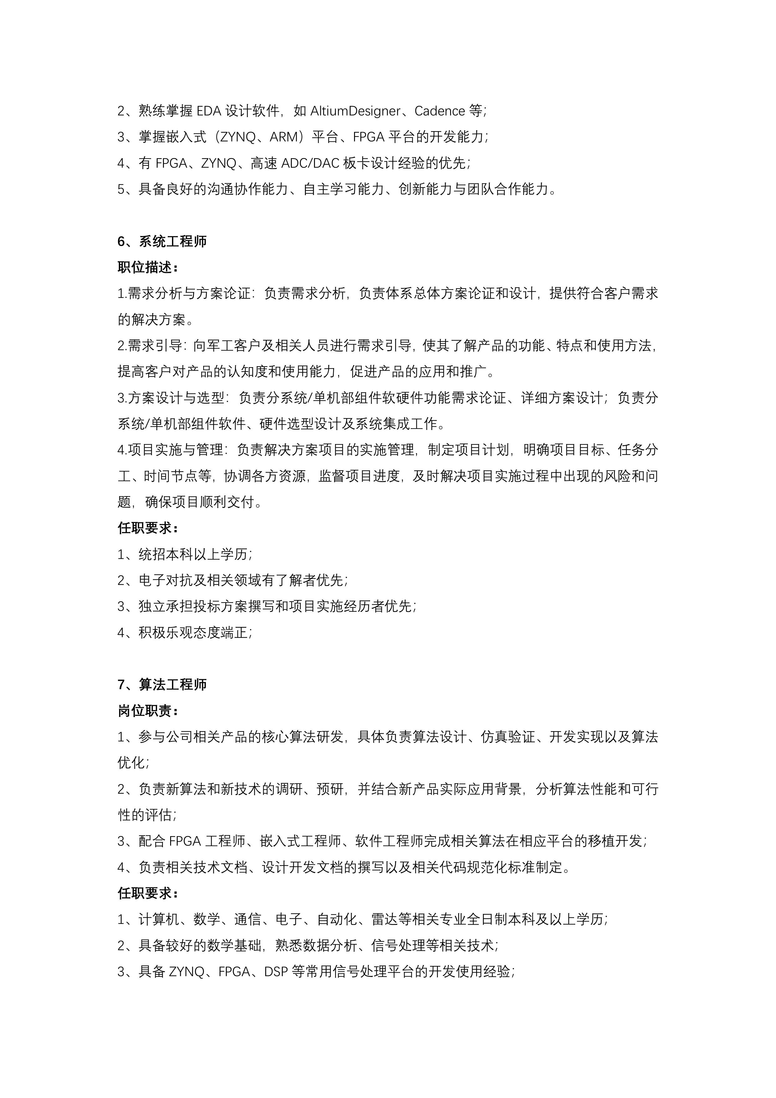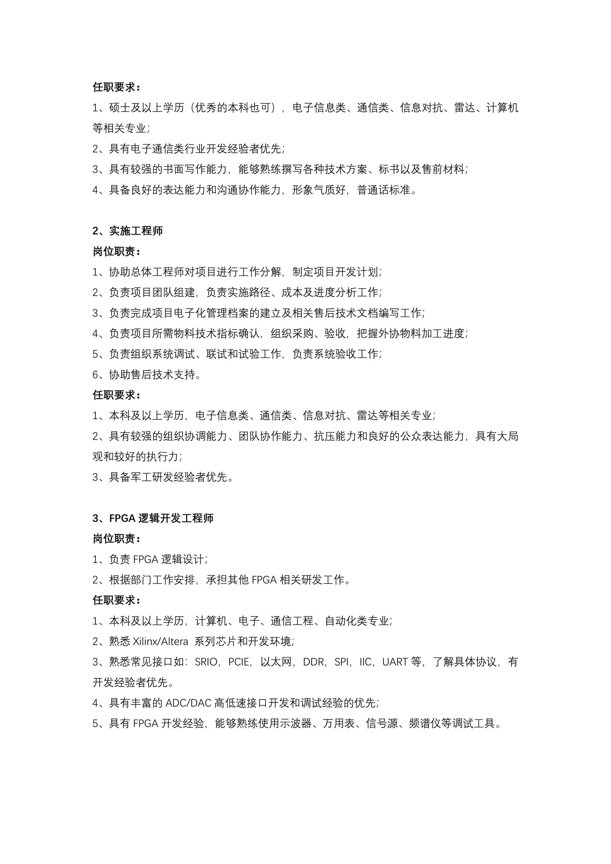 📖所需专业:电子信息工程、通信工程、电子科学与技术、信息工程、信息对抗、电磁场与无线技术、计算机科学与技术、软件工程、自动化、电气工程及其自动化、测控技术与仪器等相关电子类、通信类、电气类、雷达类、计算机类、软件类专业。如有相关雷达、电子对抗项目经验的专业不限。