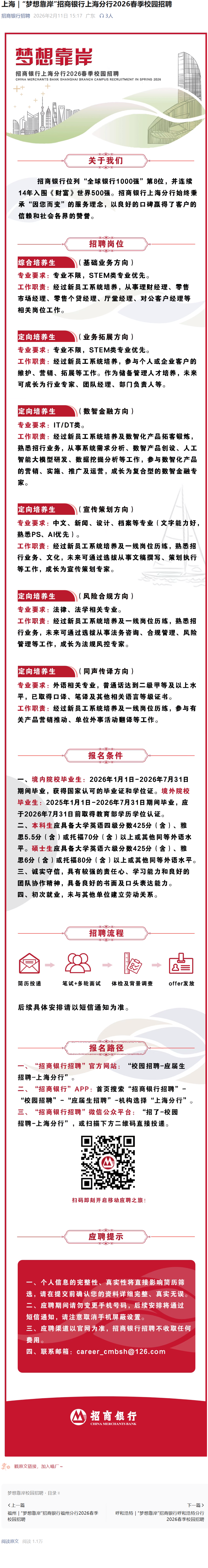 上海,等你来闯!招行,等你加入!