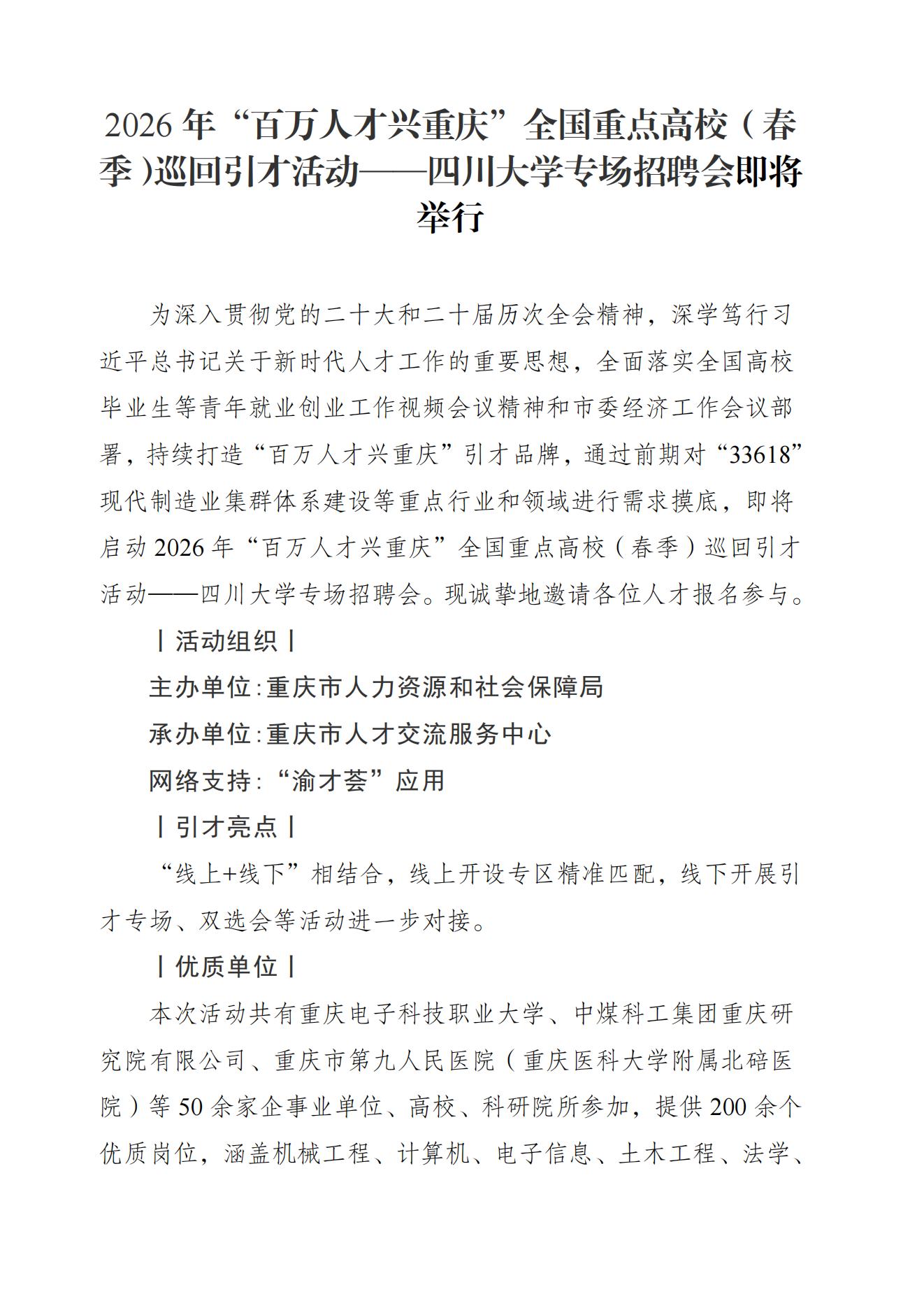 4月16日9:30就业指导中心三楼双选大厅 2026年“百万人才兴重庆”全国重点高校(春季)巡回引才活动