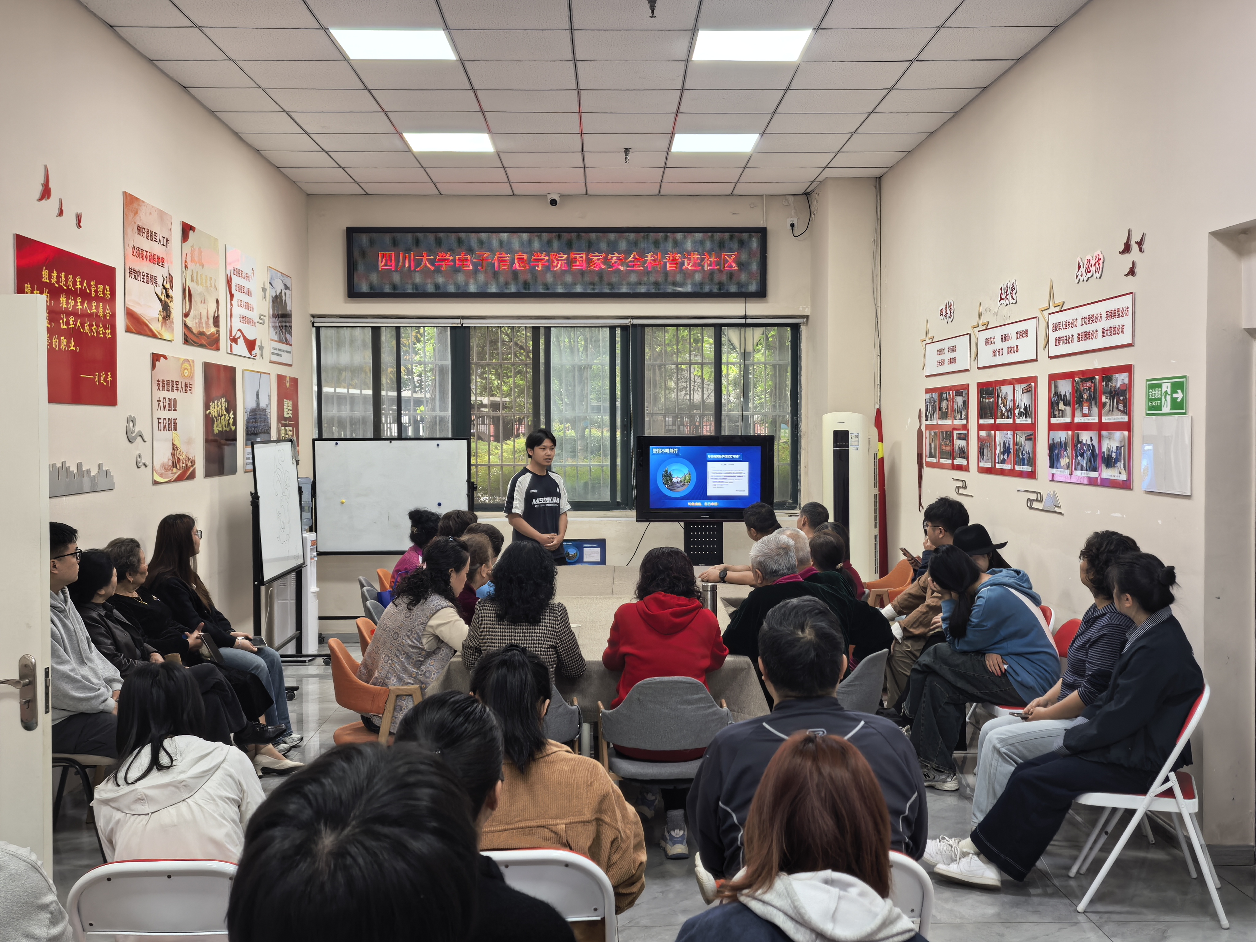 为深入贯彻总体国家安全观,增强社区党员科技安全与网络安全防范意识,2026年4月10日上午,四川大学百川青年学生宣讲团电子分团、bat365在线体育登录“电子之鹰”青年宣讲团走进武侯区新生路社区,开展“科技铸盾,国安无恙”主题国家安全宣讲活动。院团委副书记申鑫,宣讲员成员邹凯宇、杨烁彤和社区20余名党员参与。