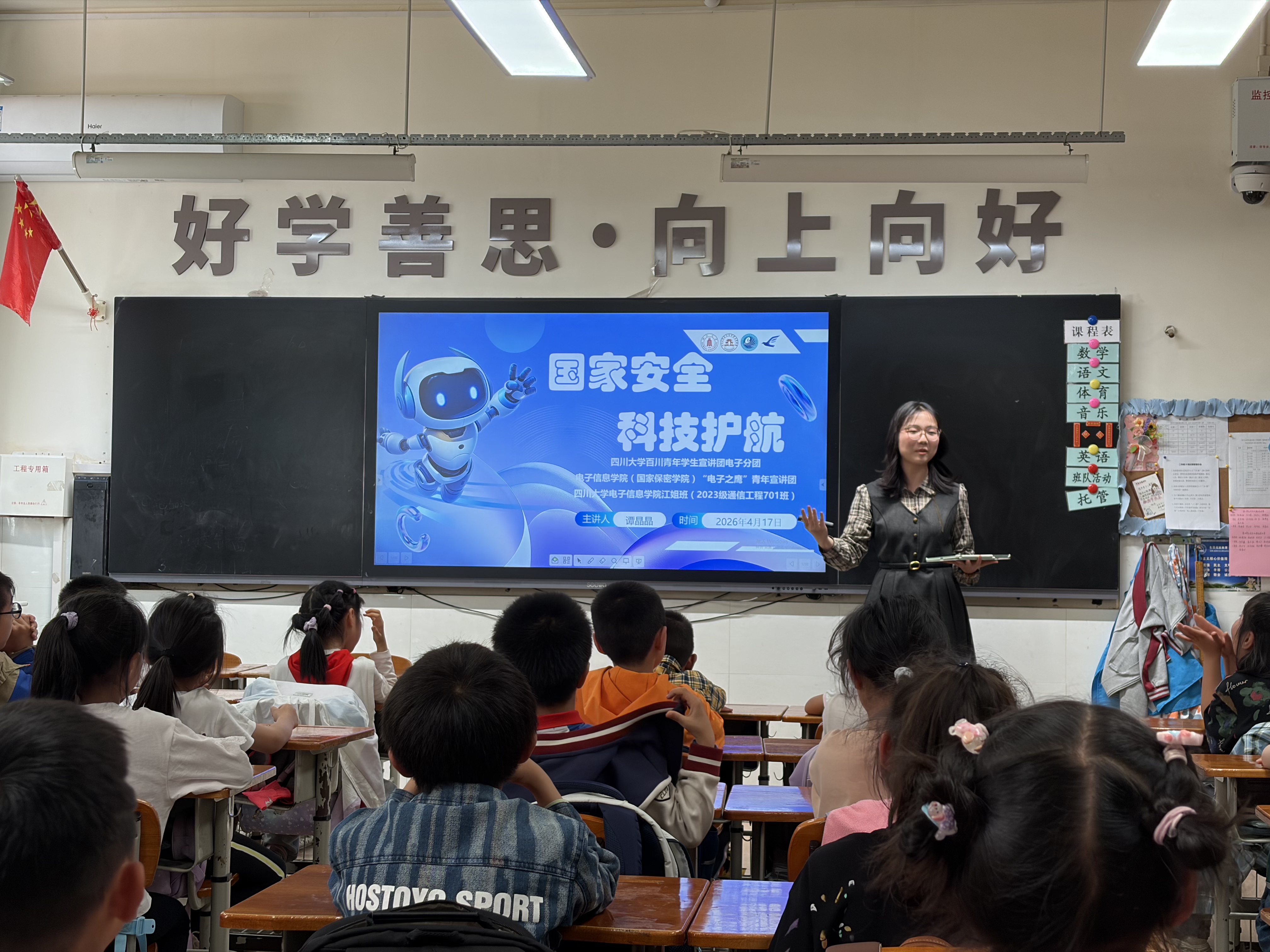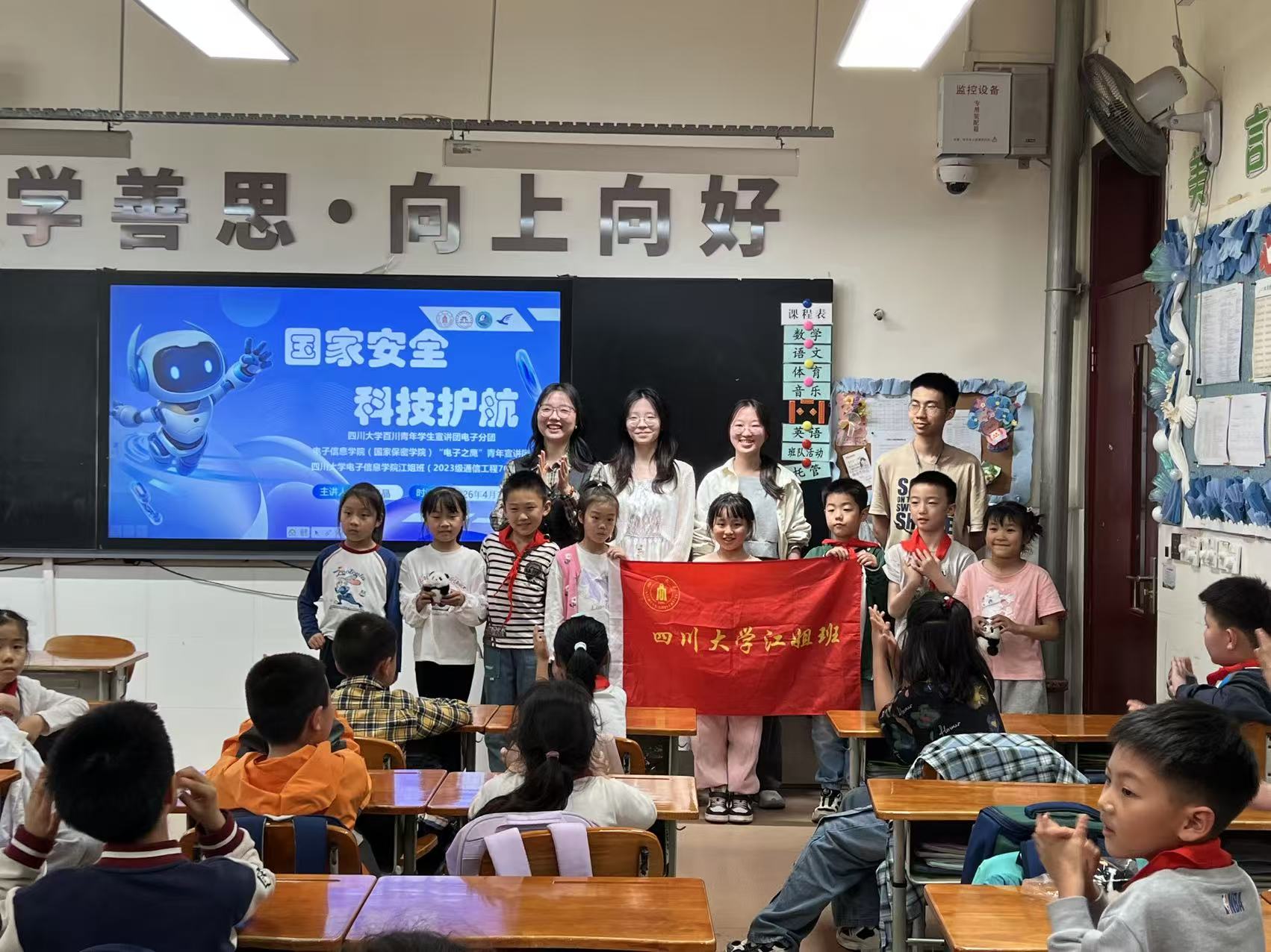 为深入贯彻总体国家安全观,增强青少年国家安全意识,在青少年心中播撒“科技报国”的种子,4月18日,四川大学百川青年学生宣讲团电子分团、bat365在线体育登录“电子之鹰”青年宣讲团,联合bat365在线体育登录江姐班(2023级通信工程701班),共同走进四川大学附属实验小学,为二年级的小朋友们带来了一场主题为 “国家安全,科技护航”的生动宣讲活动。