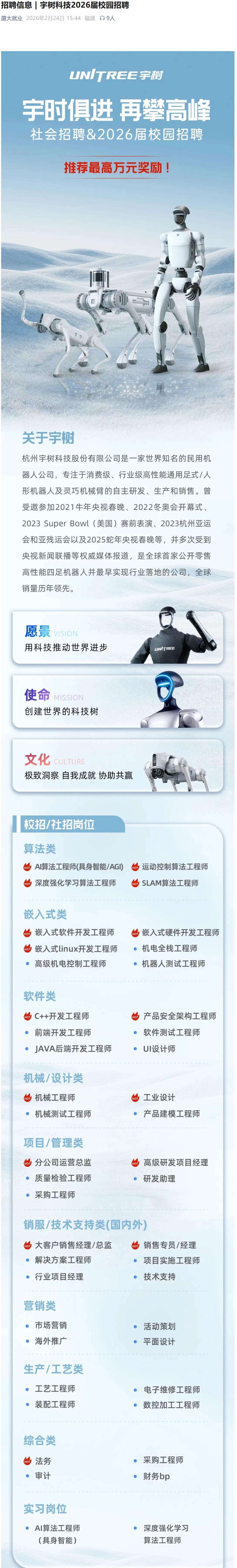 宇树科技2026届校园招聘